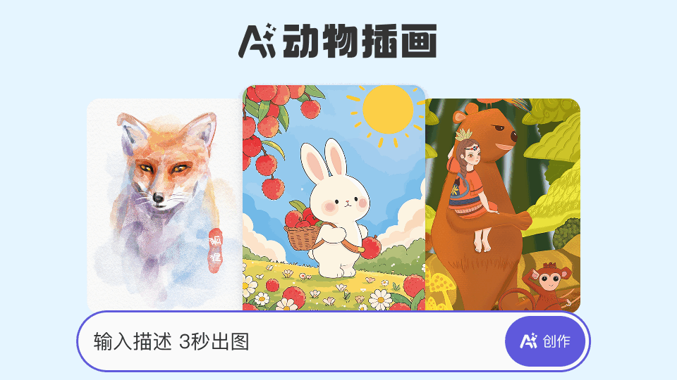 点击“AI创作”,AI将在几秒内自动绘制出高质量动物插画,适用于绘本、文创、电商展示等多种用途。多场景适用 极速出图