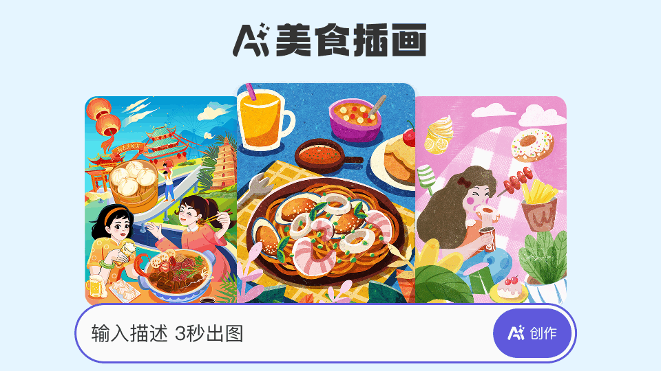 点击“AI创作”,AI将快速生成一幅专属的高清美食插画,满足商业、社交、展示等多种创意需求。多场景适用 极速出图