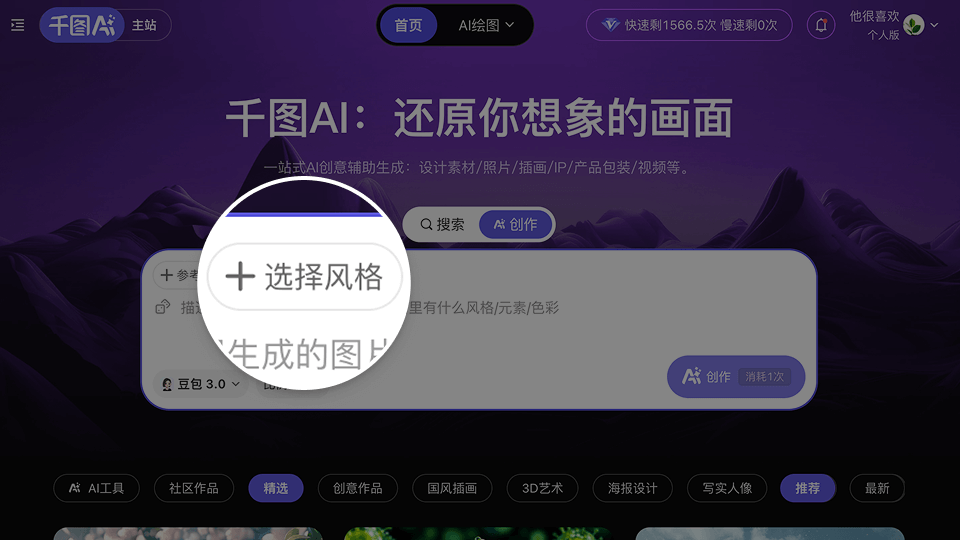 挑选你想要的插画风格类型,如赛博未来、复古潮流、极简线稿、奇幻唯美等,确定视觉方向。第二步