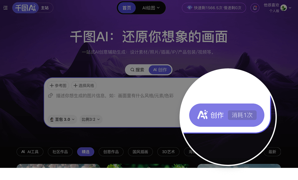 点击“AI创作”,AI将快速完成创作,呈现高质量、可下载的原创数字插画作品。多场景适用 极速出图