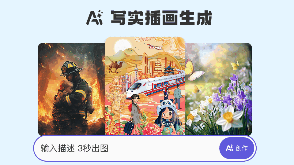 点击“一键生成”,AI将在几秒内输出高清写实风格插画,适用于广告视觉、出版插图、故事绘本、品牌内容展示等多种场景。写实插画 · 场景一览