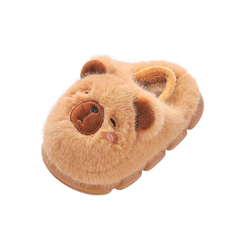儿童毛绒拖鞋宣传图,主体为卡皮巴拉造型毛绒拖鞋,鞋面毛绒柔软,有小熊五官,浅棕色鞋底,无文案,可爱风,居中构图,白色背景,特写镜头