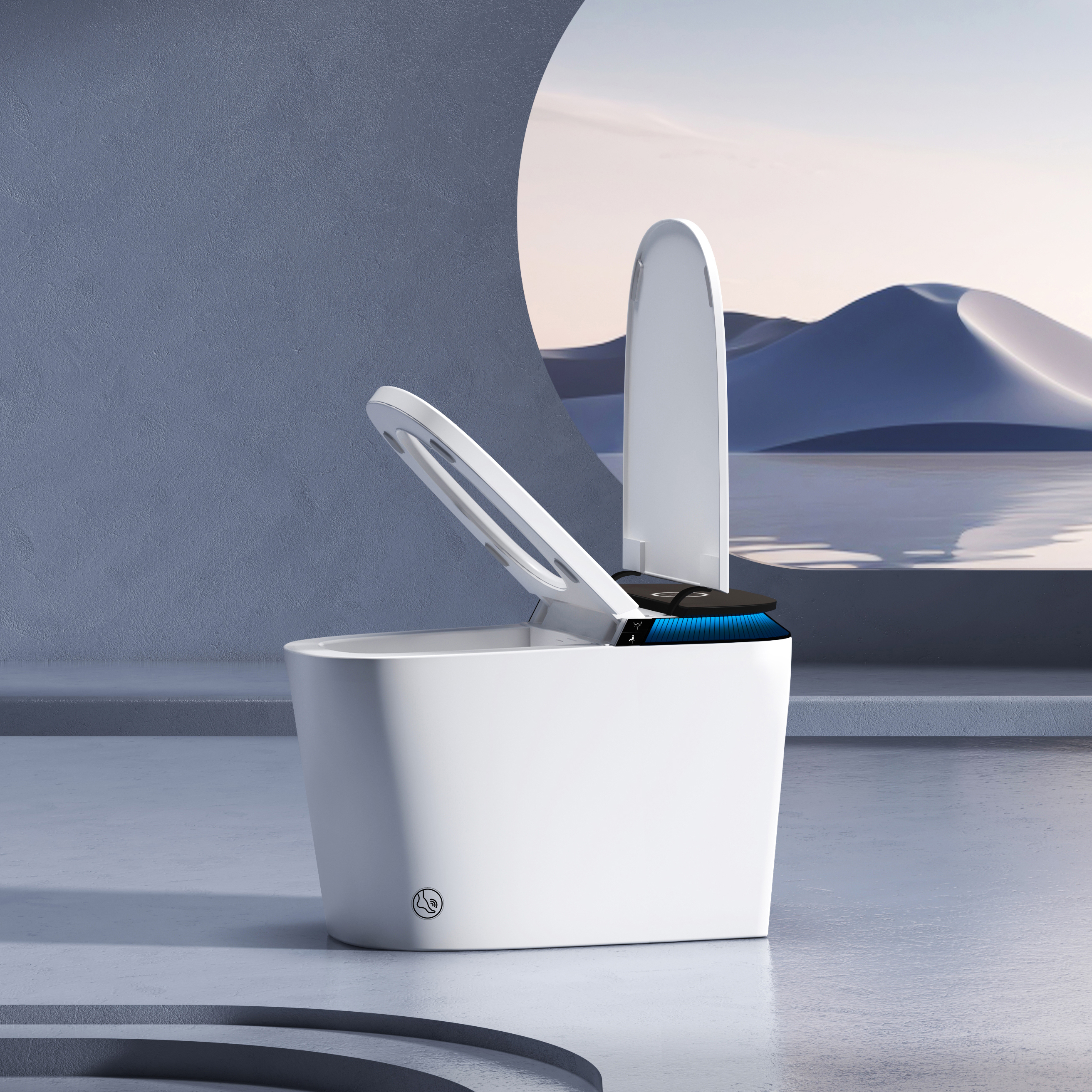 极具未来感与科技感的设计风格,主体是一个马桶,但并非普通的马桶,而是被各种精密的机械结构、管道和发光元件所环绕。整体以冷色调的蓝色为主,搭配上霓虹般的灯光效果,营造出一种科幻氛围。这些复杂的机械装置让马桶看起来像是存在于未来太空舱或高科技实验室中的设备,仿佛具备了先进的功能,展现出对未来生活设施科技化的想象,给人一种充满科技魅力与新奇感的视觉体验。