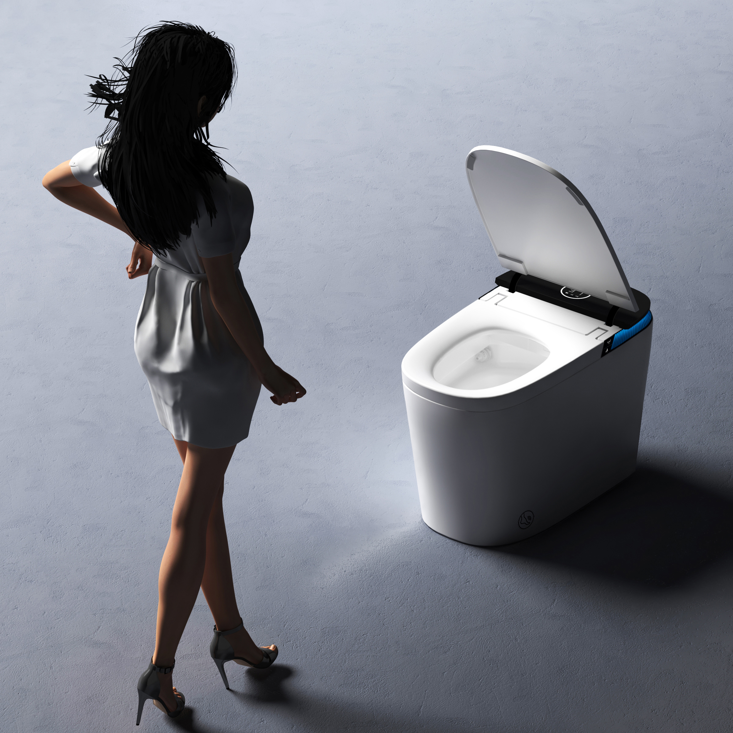 采用科技感十足的设计风格,主体是一个半透明的蓝色马桶模型,内部通过透明材质展示出类似人体骨骼的结构,包括肋骨、脊柱和腿部骨骼,形成一种荒诞又极具冲击力的视觉隐喻。背景是深色的科技界面,布满蓝色的线条、数据图表和参数面板,右侧有悬浮的信息窗口,显示着类似健康监测的数据和图形,整体营造出一种未来医疗或生物科技的氛围。画面以冷色调为主,蓝色的马桶与骨骼结构形成鲜明对比,科技元素的加入增强了画面的前卫感和探索性,传递出对科技与人体、日常物品与生物结构之间关系的独特思考。