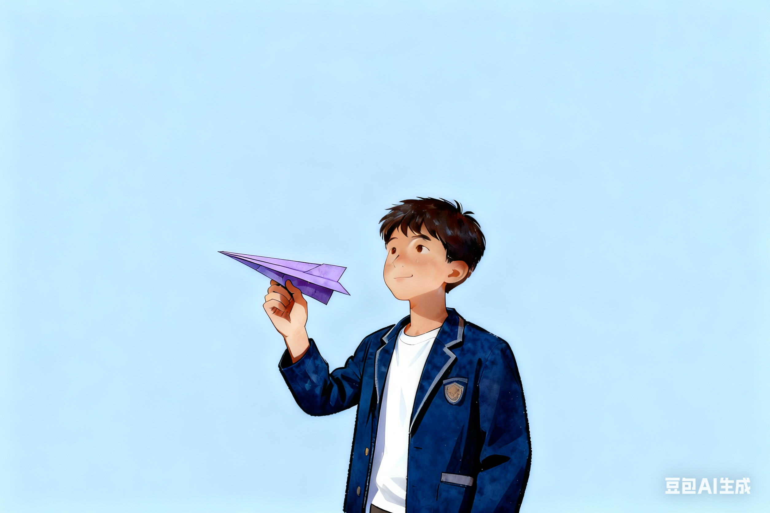 参考图片中的人物动作,重新生成一张图片,穿着六十年代白衬衫戴着红领巾的青少年,手里拿着红色纸飞机正要飞