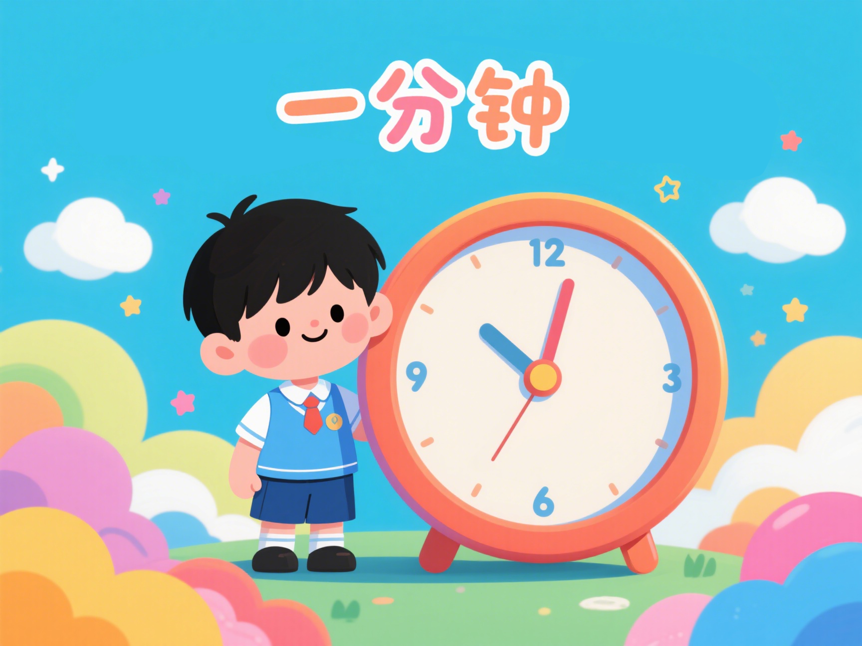 画面主体是一个背着书包的小男孩,他头戴蓝帽,身穿条纹上衣和蓝色裤子,脚蹬绿鞋,面带笑容向前迈步,充满了上学的快乐。他右手拿着一个黄色闹钟,闹钟有可爱表情,身旁围绕着拟人化的文具,有粉色铅笔、橙色橡皮、紫色书本等,都带着笑脸,十分萌趣。背景是蓝天白云,下方是翻开的书页,整体色彩鲜艳,充满童趣,让人感受到小男孩上学的愉悦心情。