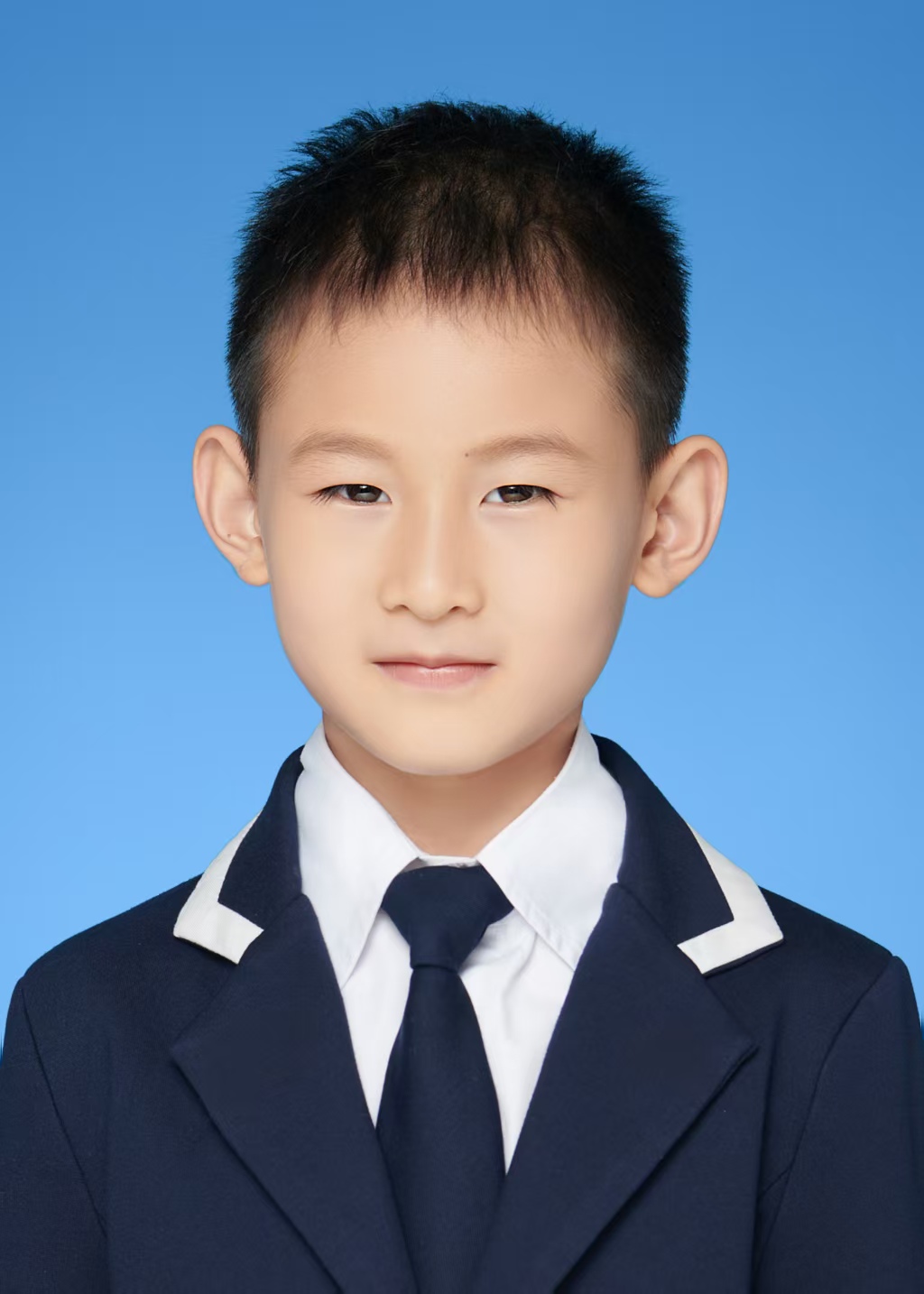 一个穿着整洁校服的中国小男孩,白色衬衫搭配浅卡其色裤子与白色休闲鞋,背着蓝黄拼色的双肩书包,正在行走,背景为简洁浅灰色,整体风格清新、充满校园活力 ,光线均匀柔和,突出童真与朝气,营造出自然、青春的校园氛围 。 高清照片【3:4】