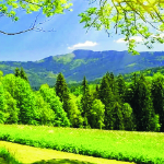 超大场景超大视野近景古代长卷竹简,正放的竹简上有一朵花,竹简要圆润透亮上面有泼溅水珠,具有极致中国美风,竹子的字是毛笔书写而成的,中景是娇嫩翠绿色竹子,山水中有隐约可见的一座阁楼,背景乳白色为色调
