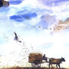 水墨风日出云海,金红浸染泼墨云层,飞鸟剪影阵列,宣纸纹理质感,传统美学留白构图