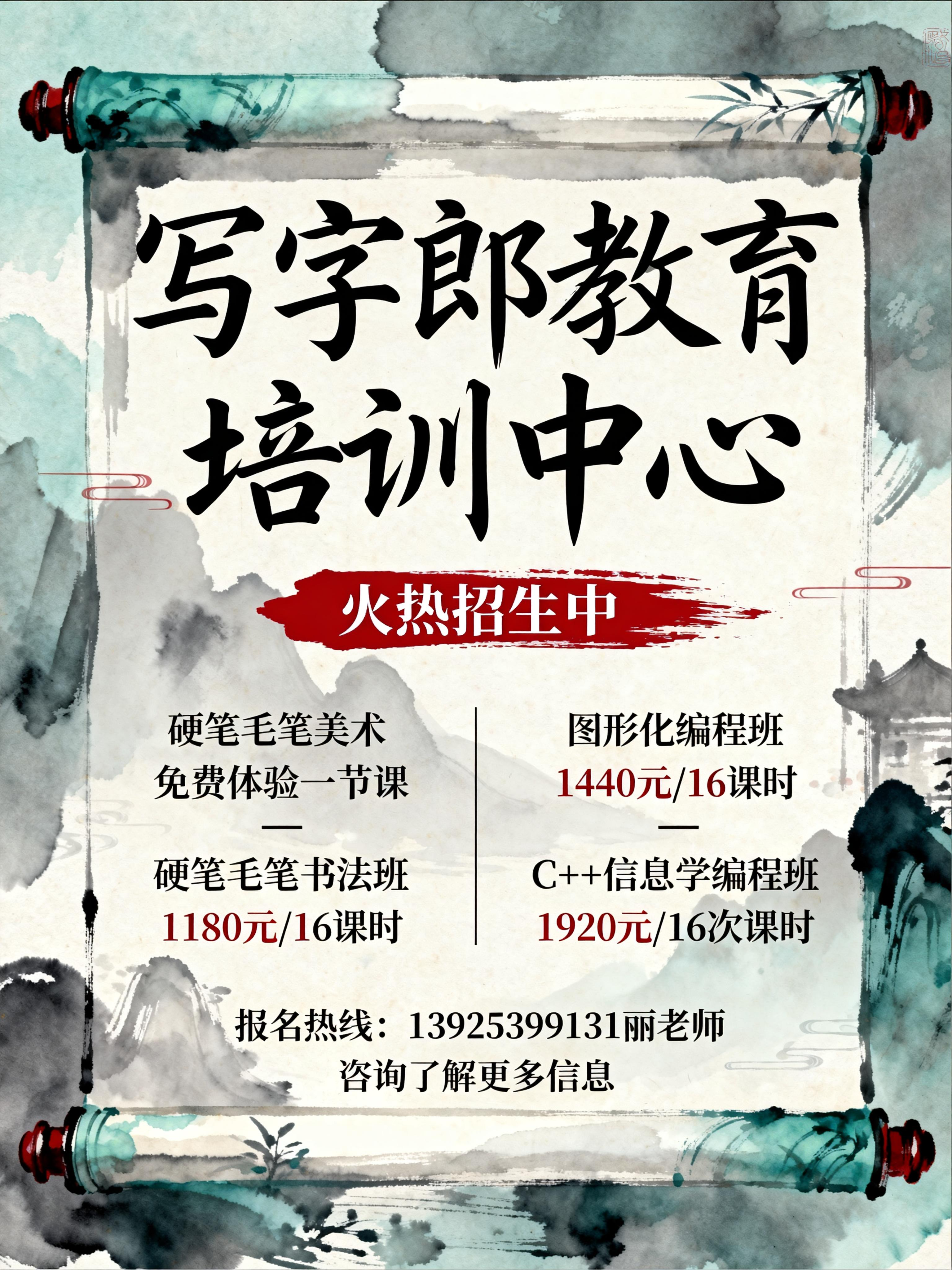 帮忙改一下那个硬笔毛笔书法班还需要加上美术 ,加上地址黄圃镇麒麟大街18号 改一下下面硬笔毛笔美术班这样子