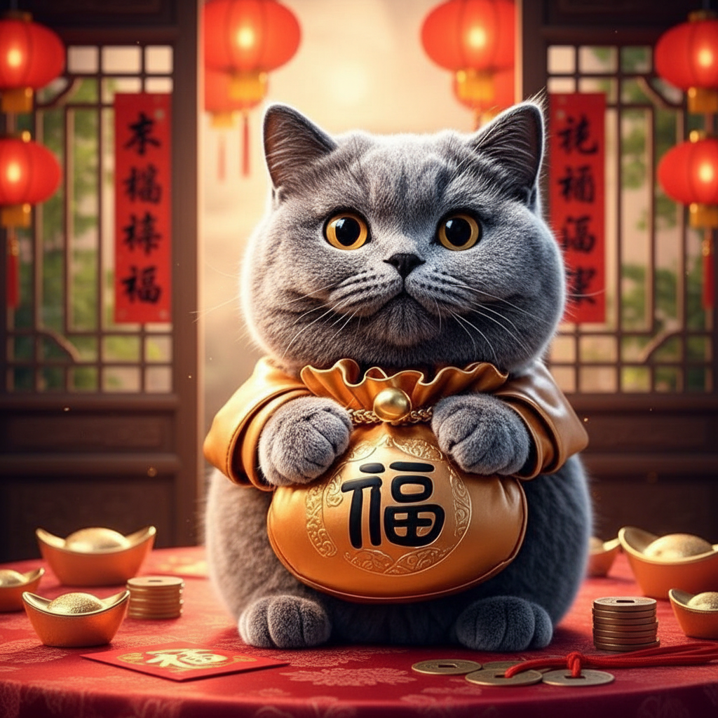 一只圆润可爱的三色猫(白色为主,带橘色和黑色斑纹),呈坐姿,前右爪高高举起呈招手动作,。左爪举,身前放着一个红色宝袋,袋口微微敞开,露出金币和元宝。猫咪颈部系着金色铃铛和红色吉祥结,胸前挂着一块写着「招财进宝」的金色牌子 眼睛:琥珀色瞳孔呈椭圆形,带有高光,眼神灵动有神 耳朵:内侧为粉红色 尾巴:蓬松卷曲,尾尖为金色 底 画质3D高清,精致细节