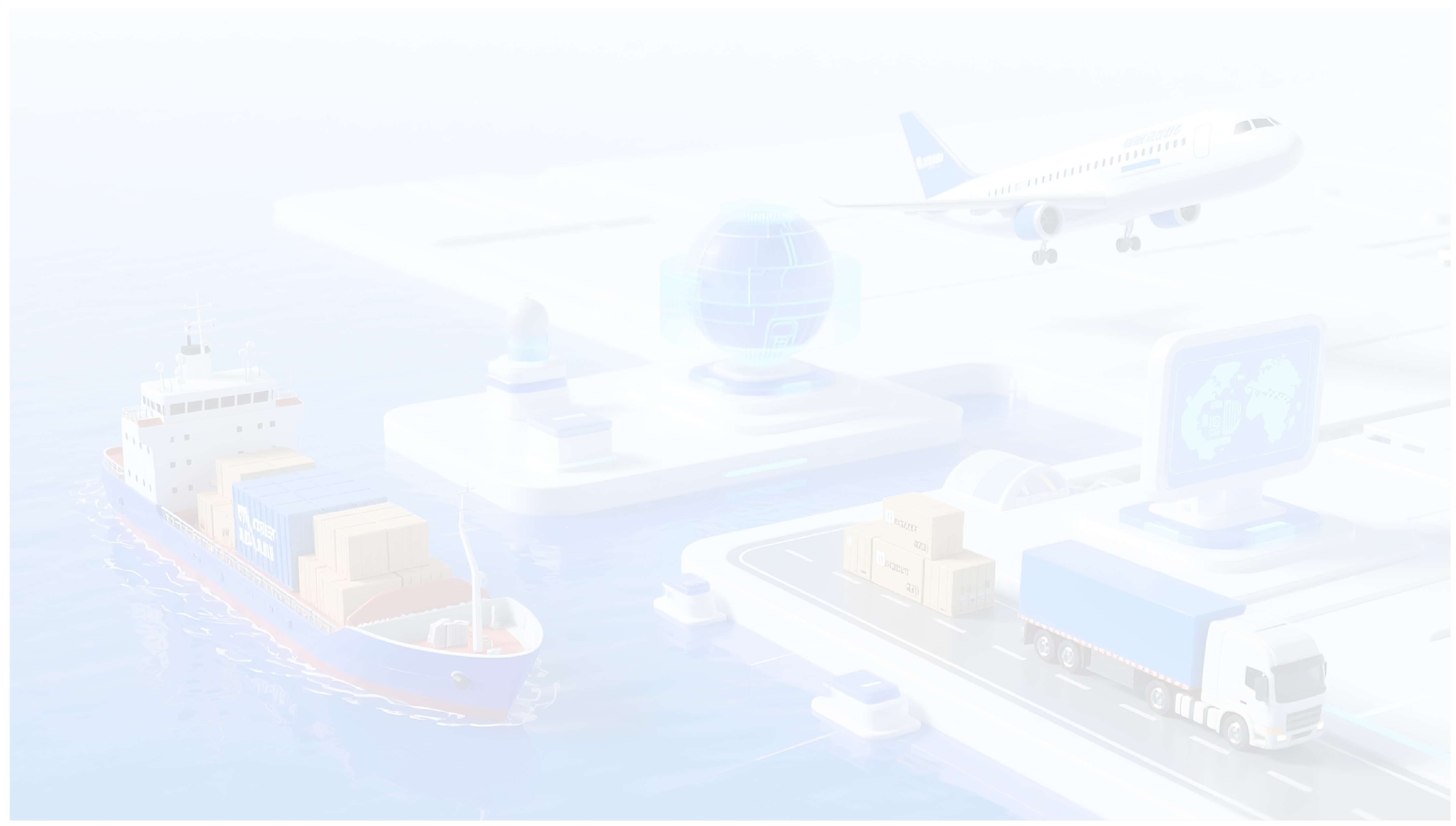 智能跨国运输微场景,水运,陆运,有货物流通,有货船运输,货车运输,空运,科技风,科技感背景,C4D白膜风格,有些科技蓝颜色