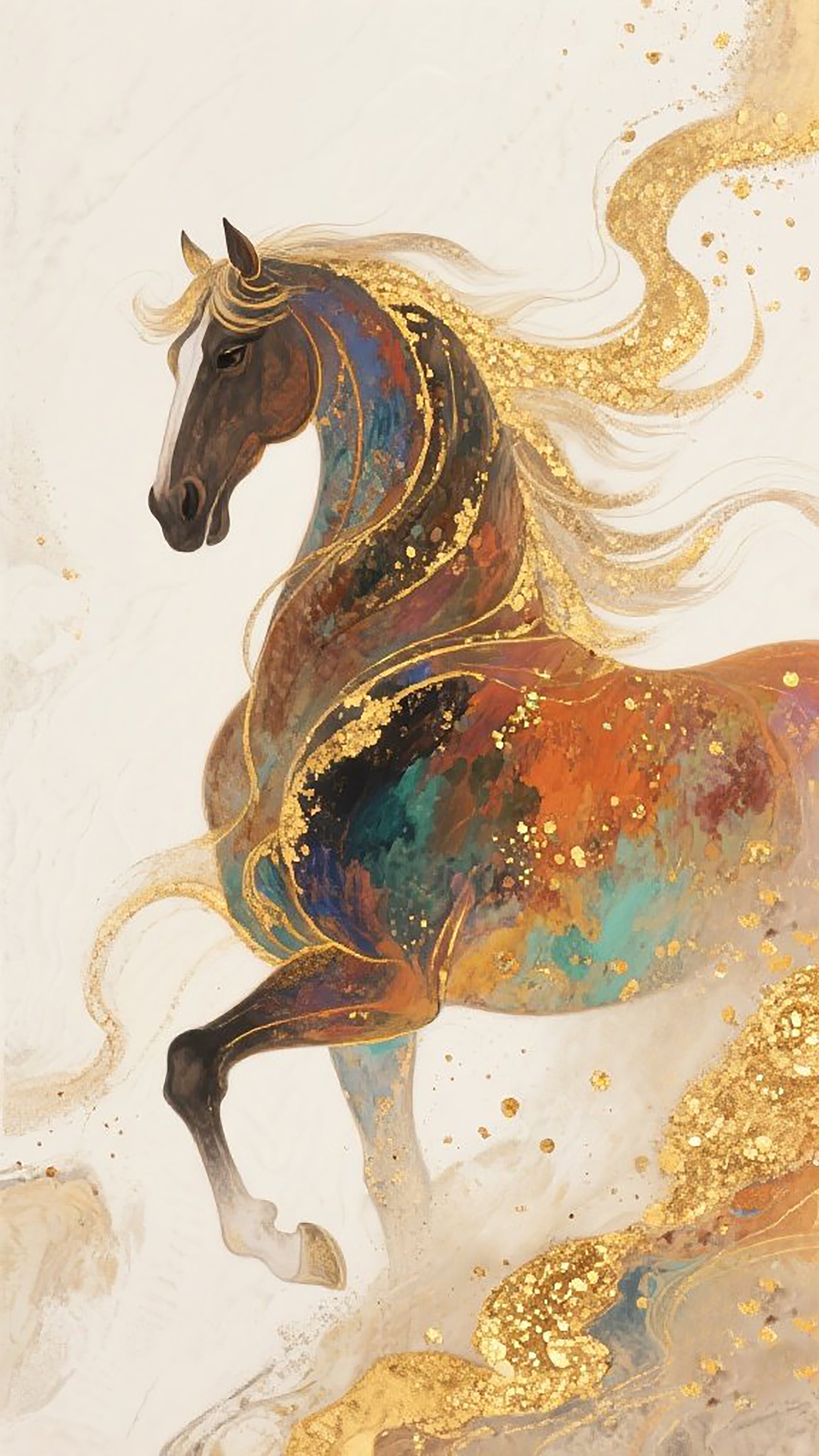 图片风格为「中国风」,比例 「2:3」水墨晕染渐变背景,马,华丽,高清,手绘,无文字水印,