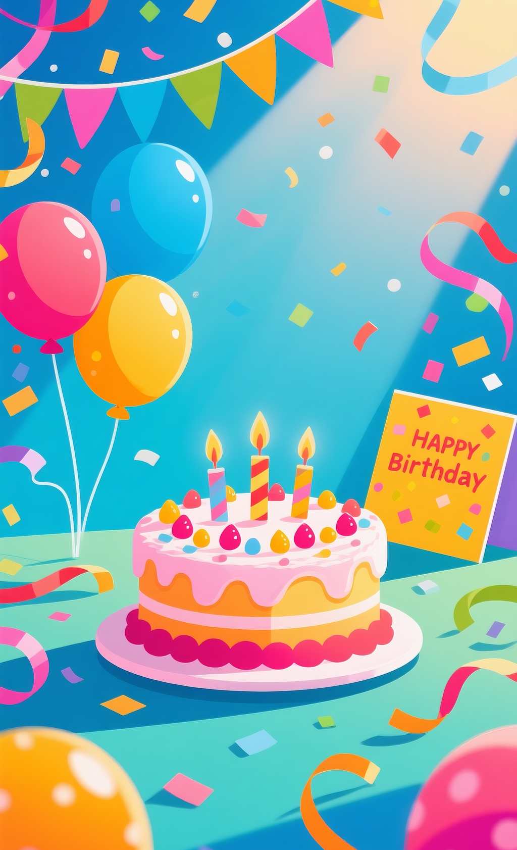 一幅创新生日快乐背景素材,彩虹蛋糕,撒落彩色装饰物,气球,糖果,丝带,五角星,礼物盒,点缀星星与泡泡元素,高清画质,电影特效,梦幻的生日快乐。