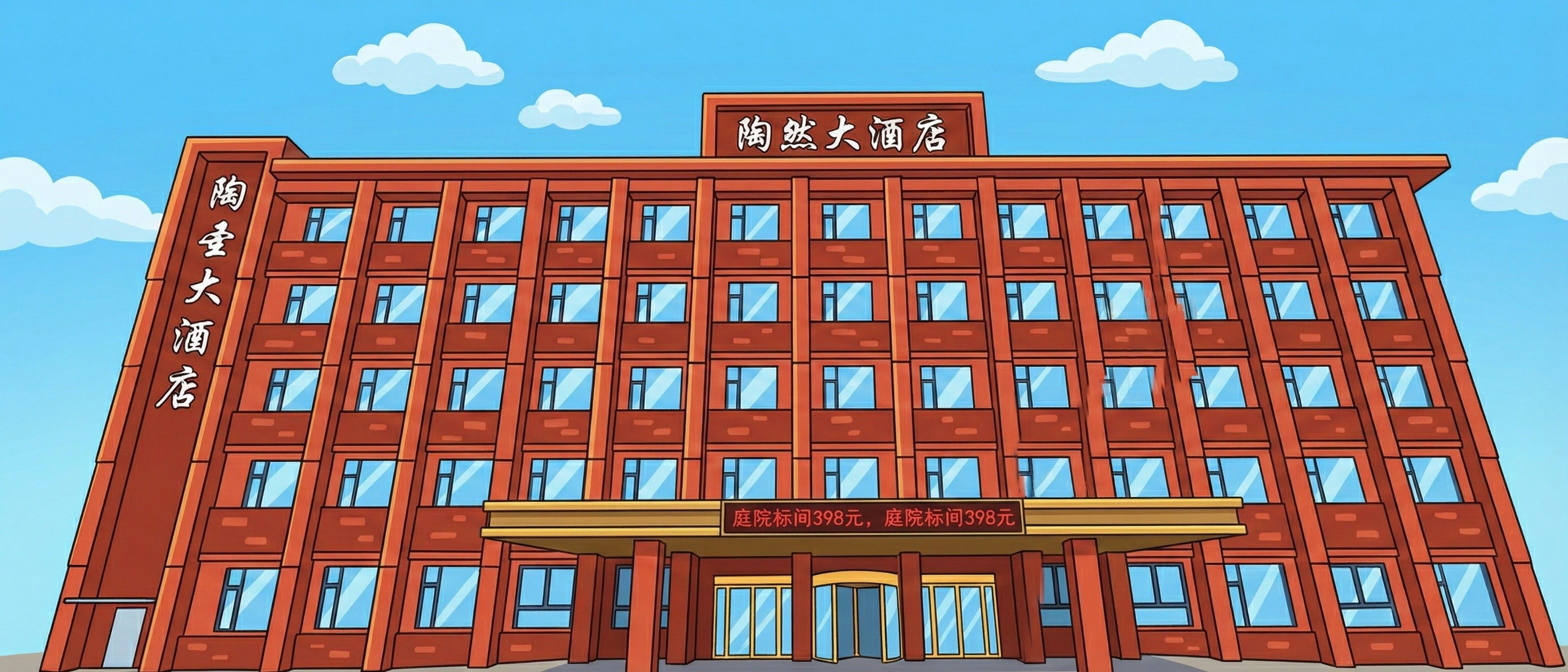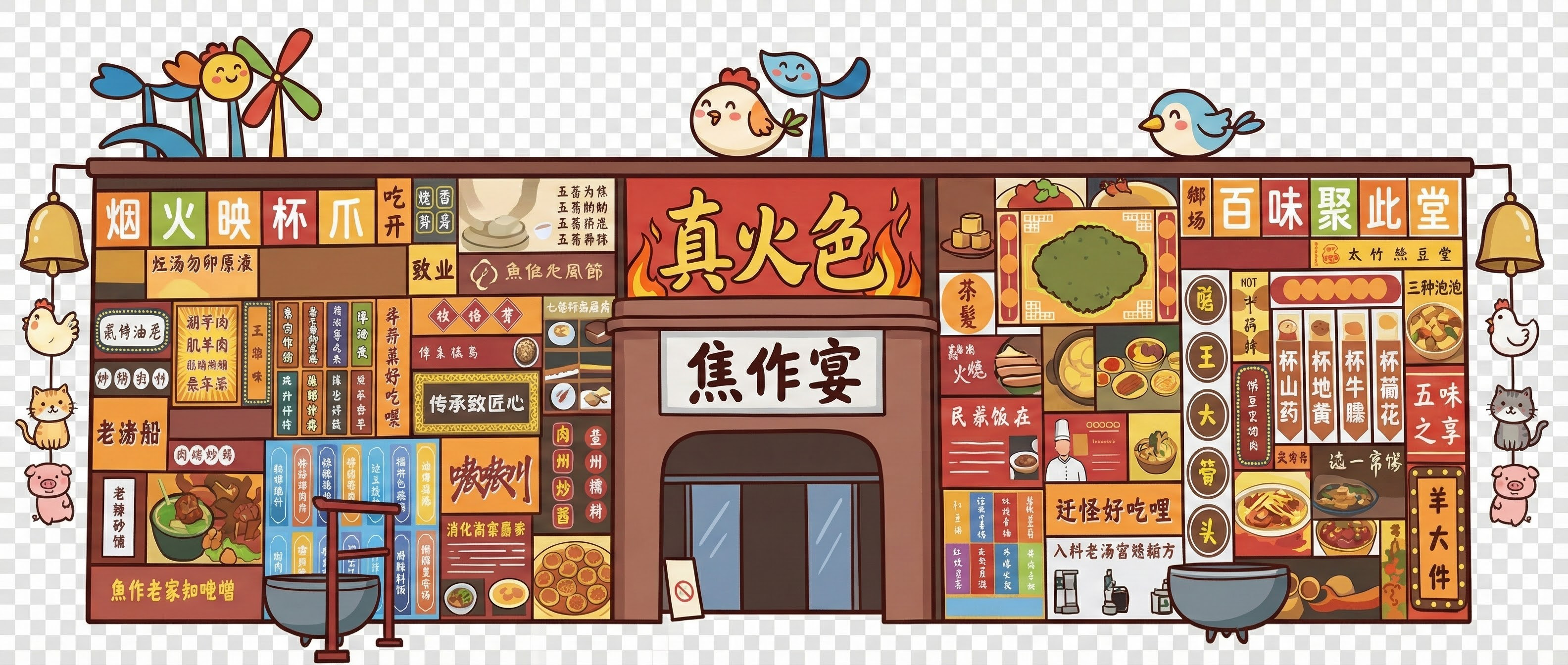创意广告图,3D可爱Q版造型,色彩鲜艳,主视觉为天空中的城市,陶圣大酒店,焦作宴,陶瓷手工,民国青年,手拿元宝财神,七仙女,瓷窑加烟囱,集市背景,飞着白鸽,暖色调背景渐变,周围飞舞着花瓣。手绘形式 中间主题“怀川火马燃梦年”