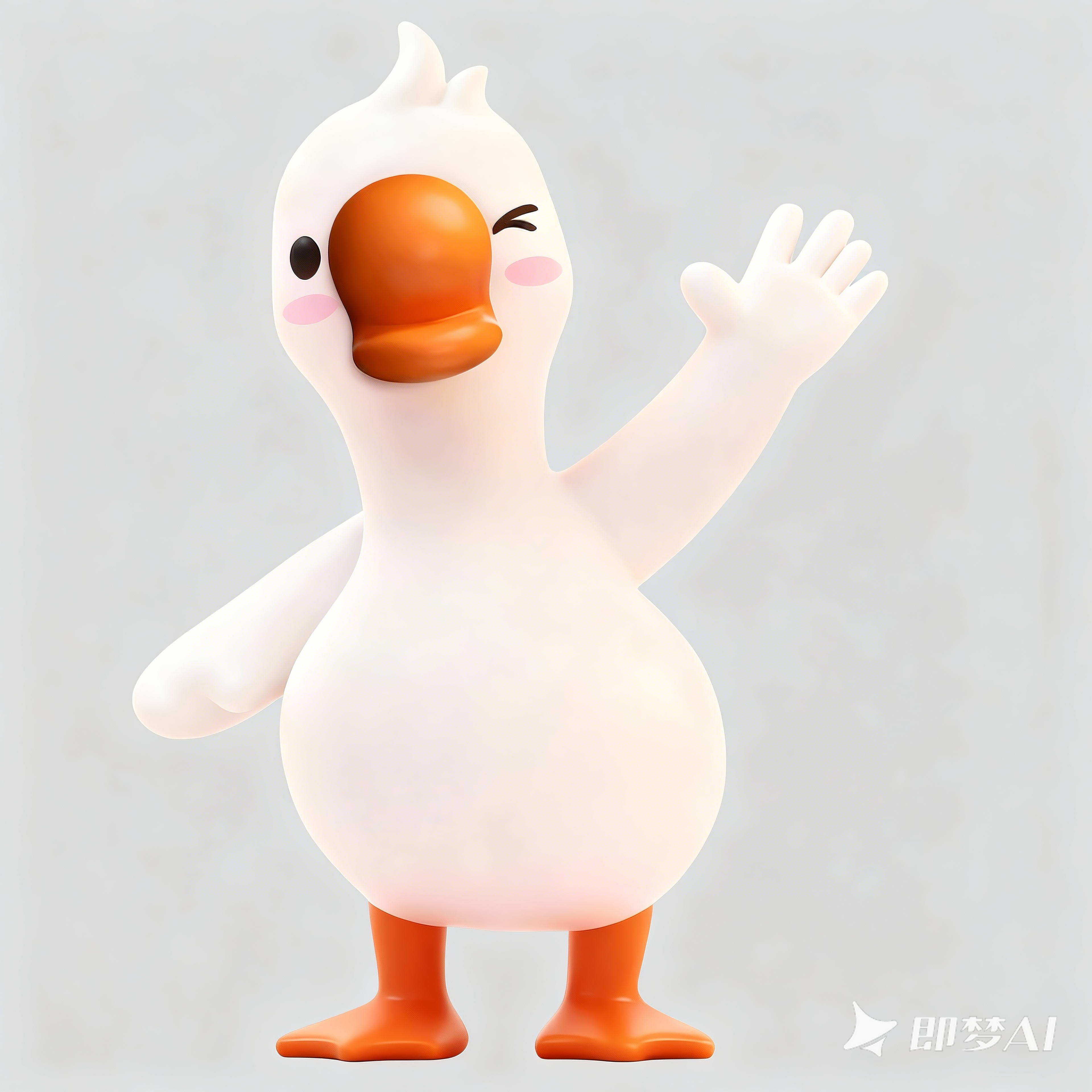 画面风格是3D卡通风格,以简洁的红色为背景。运用广角镜头,远景视角。主体是一只年幼、形象圆润的拟人化小白鹅,毛发为白色,头戴红白相间的帽子,脸颊有圆圆的腮红,神态开心,眯着眼睛露出笑容。它身着红色带黄色花纹和白色毛边装饰的衣服,骑在一条橙色的锦鲤大鱼上,手中拿着一串红色糖葫芦。画面明亮,内容细节丰富,元素完整,不做裁切。比例 2:3。
