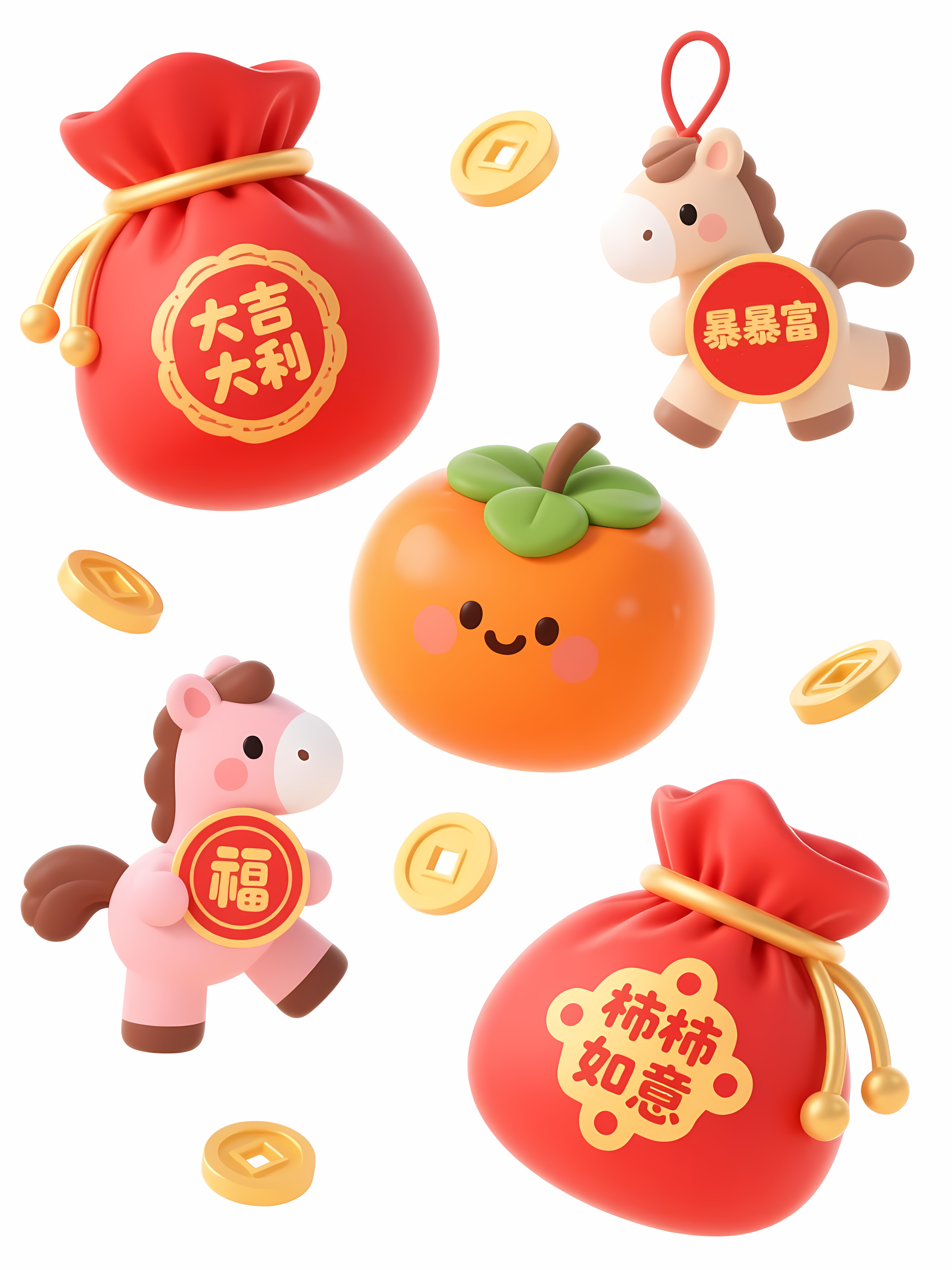 Q版卡通风格,马年新年主题元素集合插画,纯白色背景。主体包含:3只红色福袋(金线装饰、福字图案)、圆润拟人水果(橘子写“大吉大利”、柿子写“柿柿如意”,带绿叶)、2只小马新春挂饰(戴福字贴纸、周身圆形花纹)、卡通文字(“暴暴富”)、散落金币。色调以红、金黄为主,搭配绿、粉,高饱和喜庆。构图为散点式错落排列,元素边缘圆润描边,带轻微手绘质感。细节:福袋褶皱、水果文字渐变、文字装饰圆点,强化新年财运与热闹氛围。