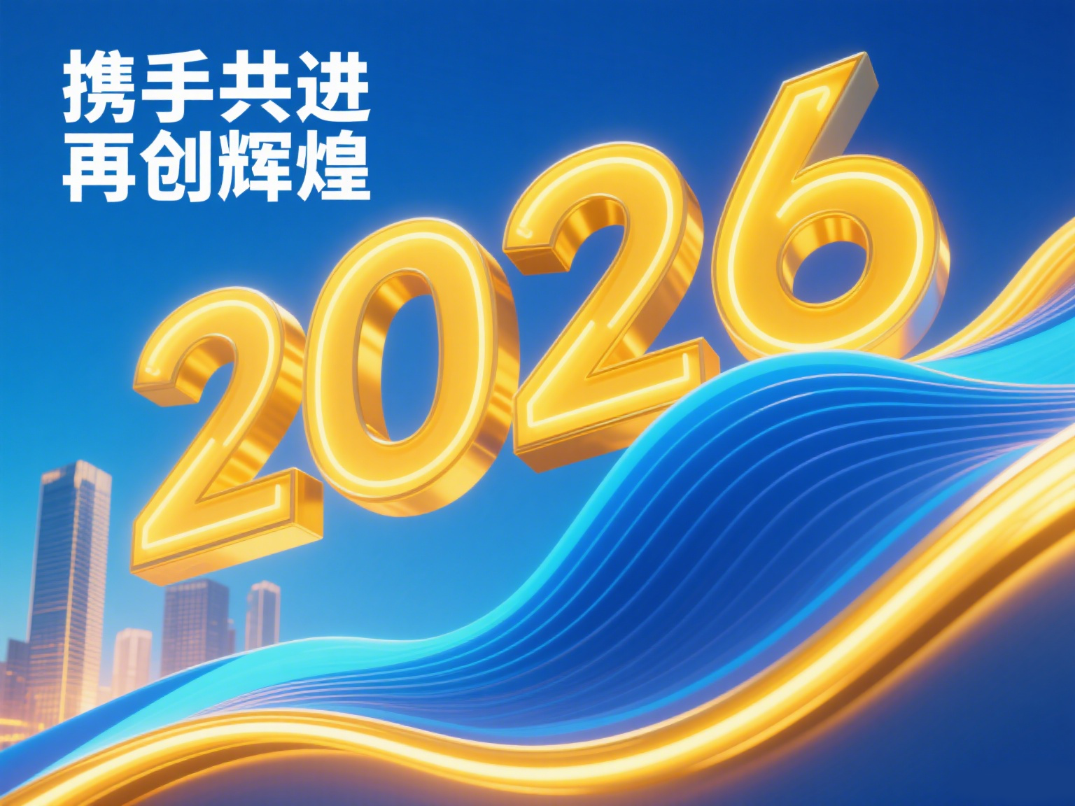 蓝色海报,左下角是城市高楼若隐若现。中间和右边是金黄色大字“2026”,波浪形排列。最前面是波浪形状的蓝色线条,金边。