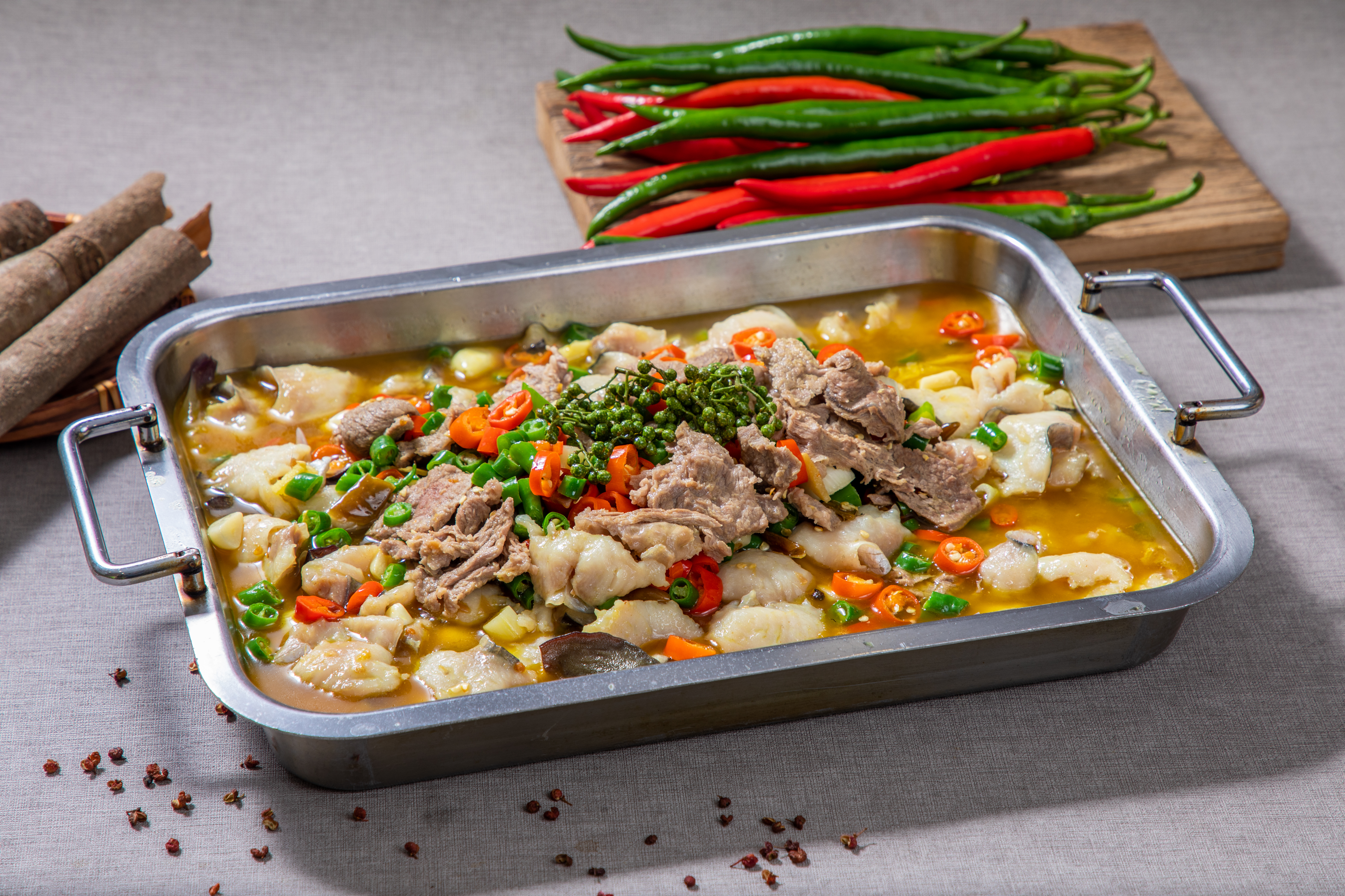 画面风格为写实的摄影风格,呈现多人围坐在桌旁享用火锅的温馨场景。一张大桌子中间摆放着一锅热气腾腾、和参考图锅底一样的火锅。周围环绕着丰富多样的食材,有新鲜的肉片、翠绿的蔬菜、圆滚滚的丸子等。所有人手上举着精酿啤酒杯,人物穿着休闲的日常服装,脸上洋溢着享受美食的满足神情。背景是暖黄色的灯光和木质的墙壁,营造出温馨热闹的氛围。画面明亮,细节丰富,元素完整且不裁切。构图上,火锅位于画面中心,食材和人物的手围绕在周围,突出聚餐的欢乐氛围。避免画面模糊、低质量和文字水印。画幅比例为 16:9。