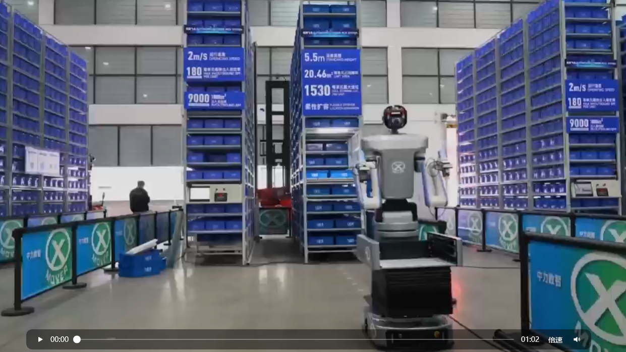 3D风格海报,工业科技风格,蓝色系,温暖活泼,画面丰富,画面里有机械臂,仓储物流,画面丰富,一群微观工人带着红色安全帽正在认真的工作