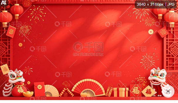 大红色背景,高级感,艺术性十足,创意设计,春节喜庆热闹气氛,合理构图,完美比例,中间大面积空间,整体肌理磨砂,噪点,弥散渐变,晕染光泽,画面顶端和底端分别搭配一两种春节喜庆热闹元素(福袋,红包,舞狮,折扇,灯笼,烟花,爆竹,礼包,窗花,福字)任选