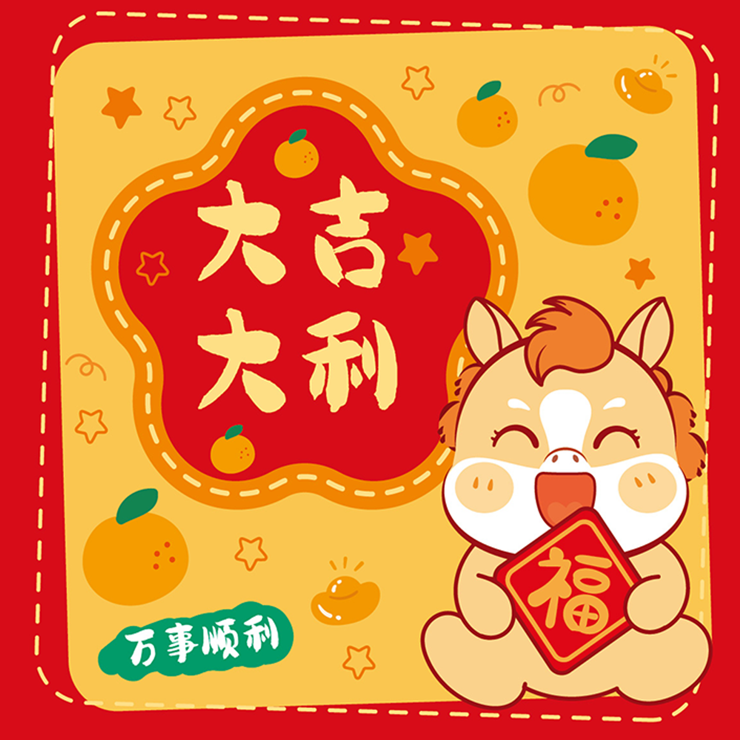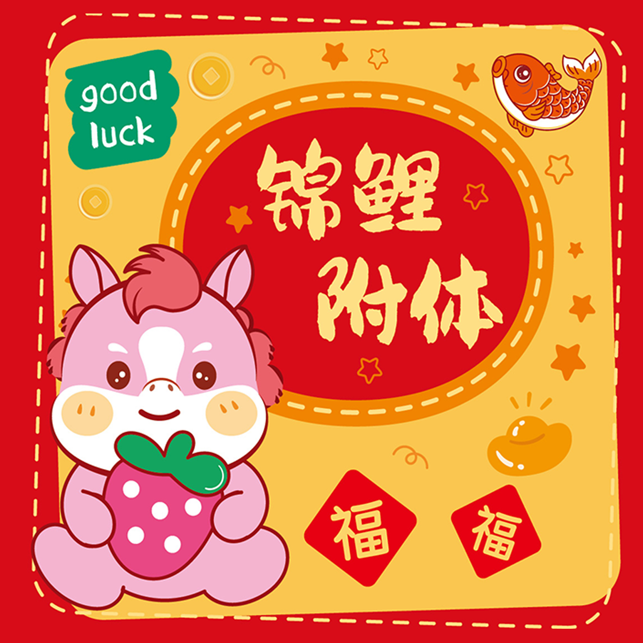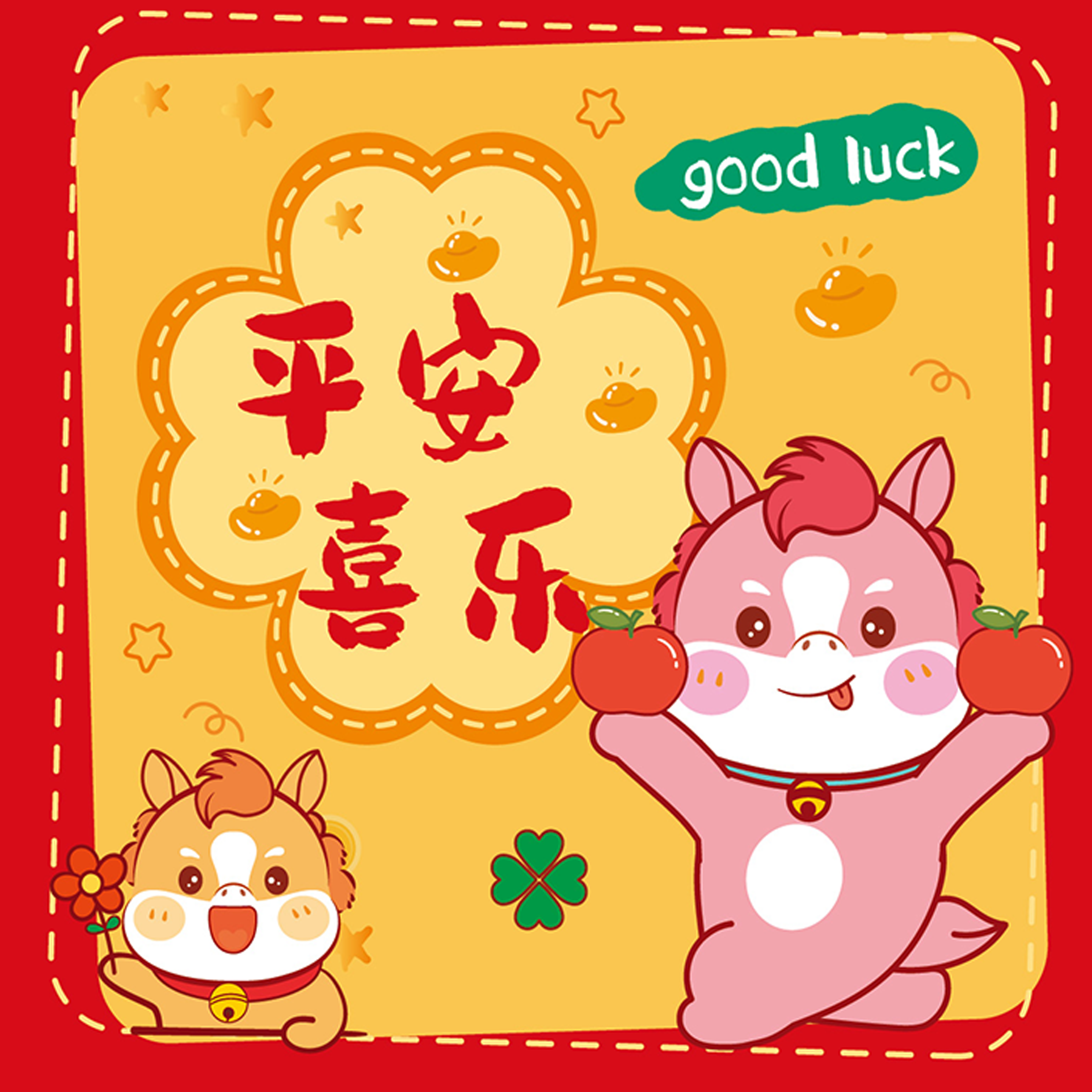 一只卡通形象的马,吉祥喜庆,过年,手提写着“吉祥如意”的灯笼