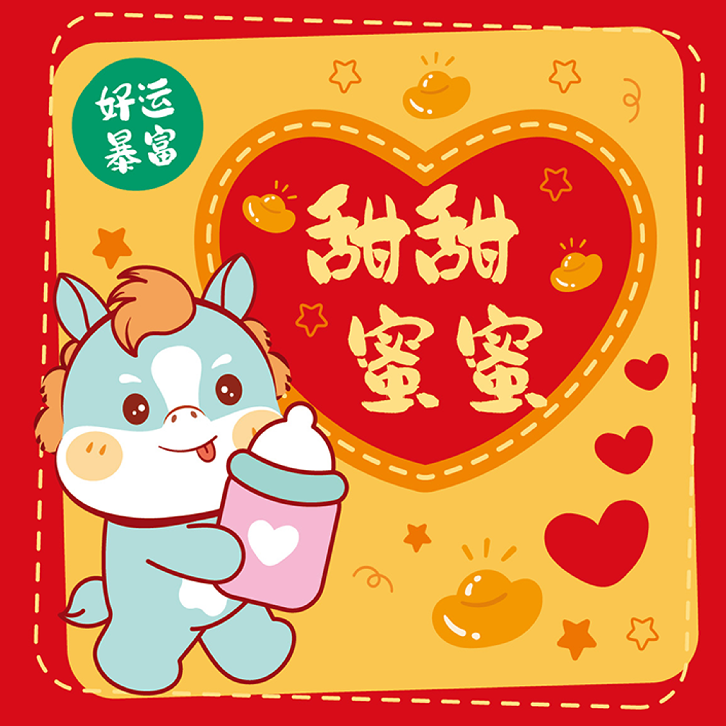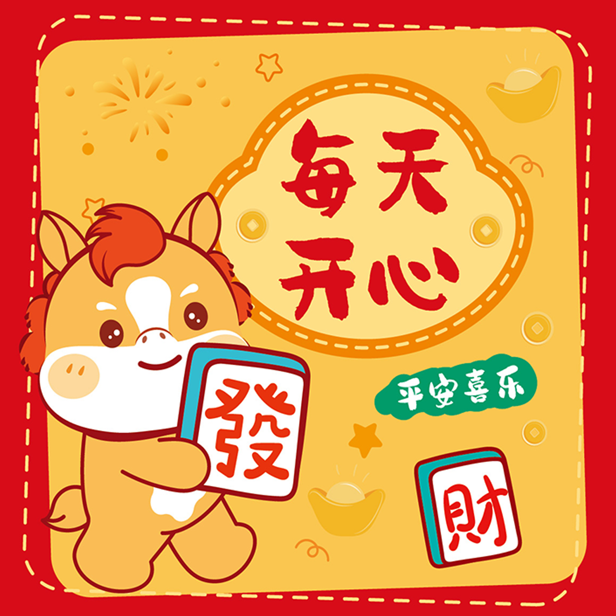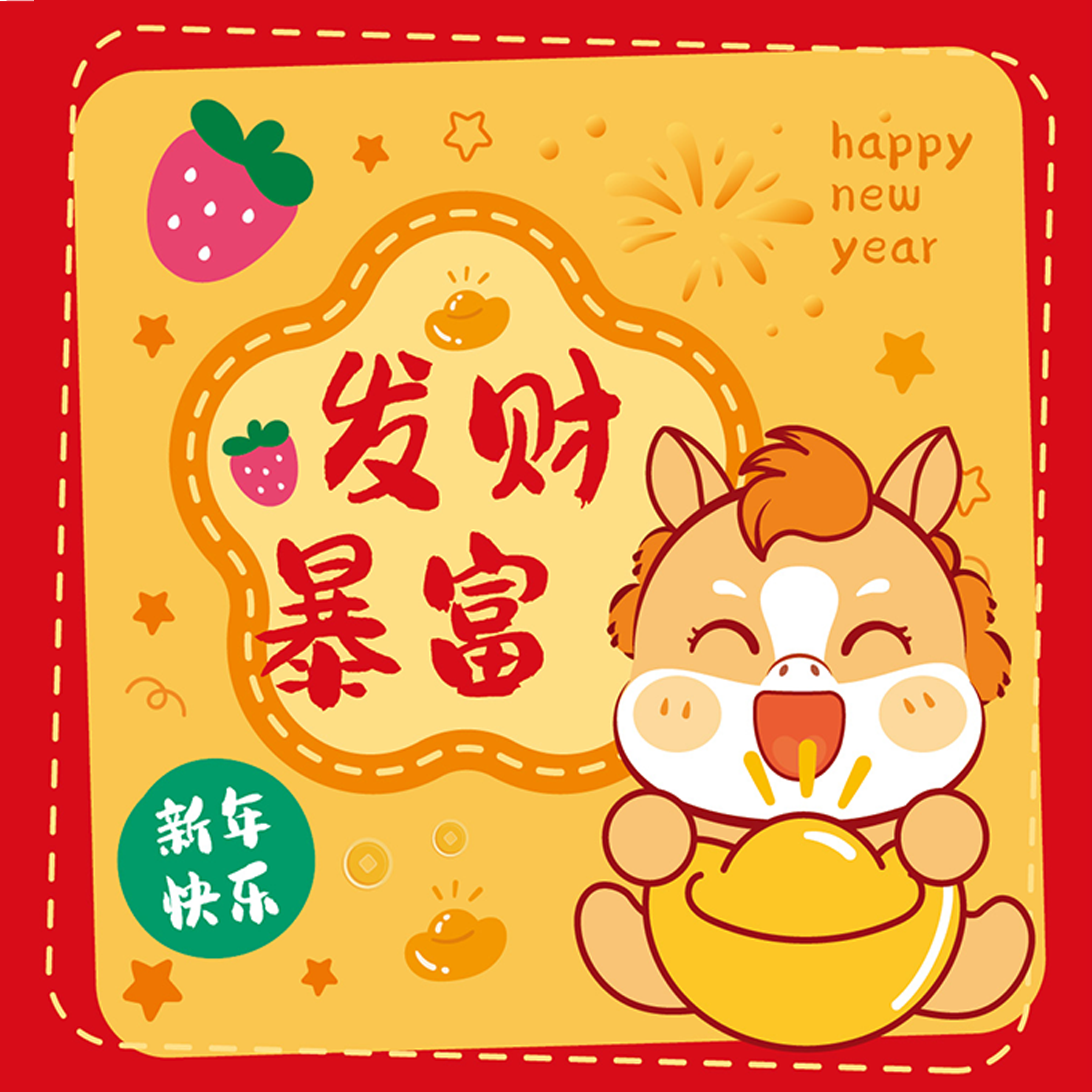 卡通马年国潮风IP形象。可爱卡通的马,主色调为金色和红色。马头上戴着红色帽。手里拿着金色春联,喜庆新年的氛围