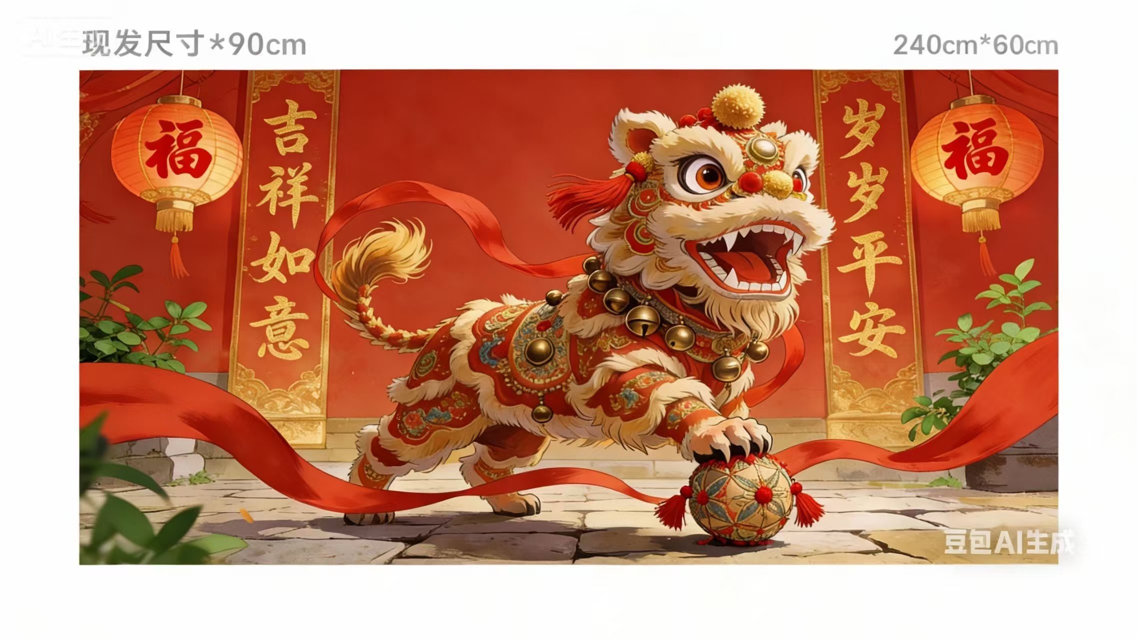 生成一只3D卡通狮子在耍球,色彩以红色和金色为主,营造热闹欢快的氛围。