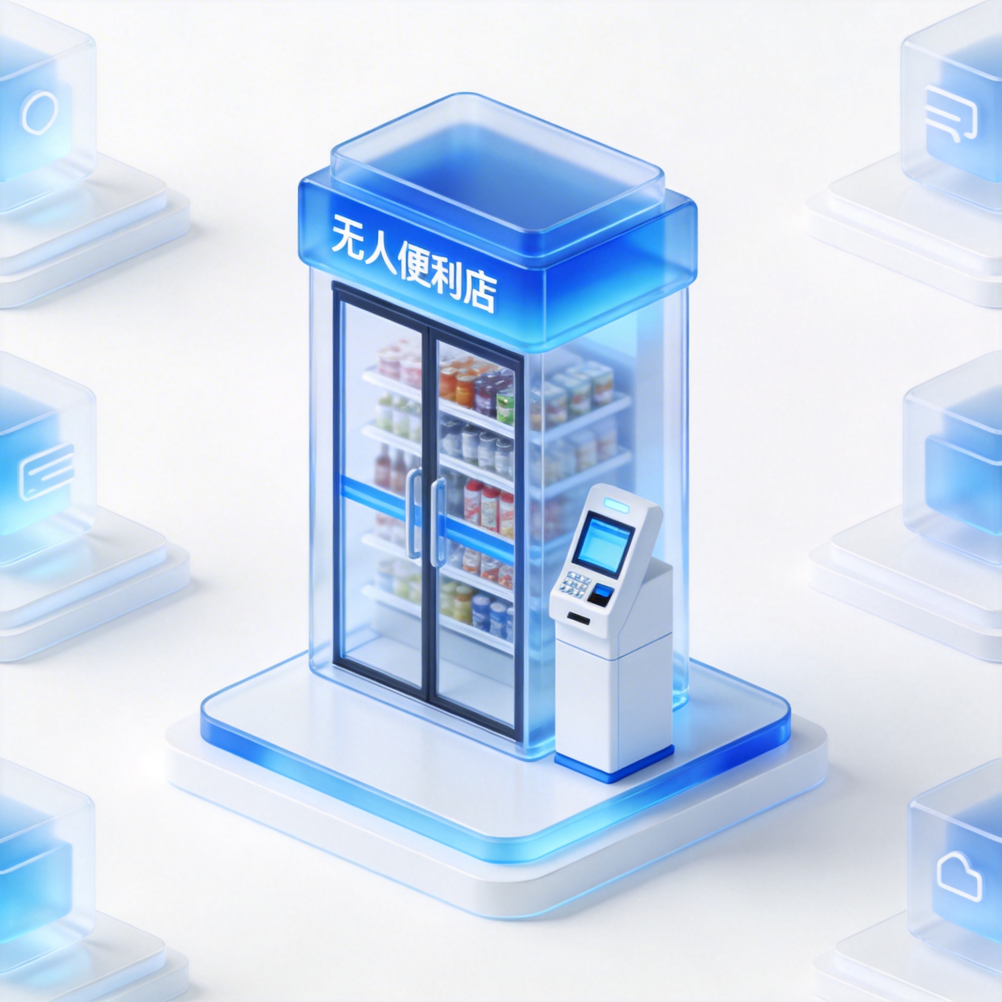 生成一个整体的图标图片背景是纯白色。图标内容:云端 POS 系统(Cloud POS System)。视觉风格:采用 2.5D 立体设计,毛玻璃质感,科技感,蓝青色为主,可辅以少量明亮色作为点缀,搭配白色元素,用于与科技、软件相关的界面或展示。 设计关键词:图标底座保持一致,透视统一,根据含义突出含义的主体设计,主体不要倾斜且视觉大小一致