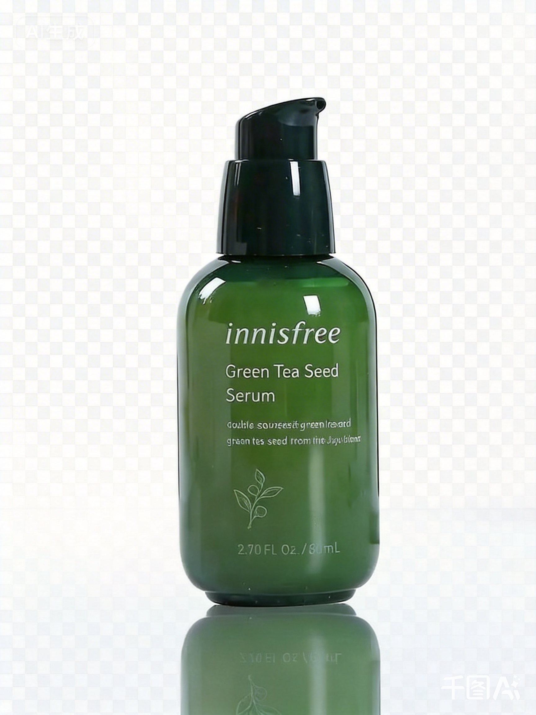 Light green cosmetic bottle,close-up,small white flowers,rocks,embedding:blurred background,light green gradient background,embedding:blurred foreground,simple background,plants,图片中为产品图。