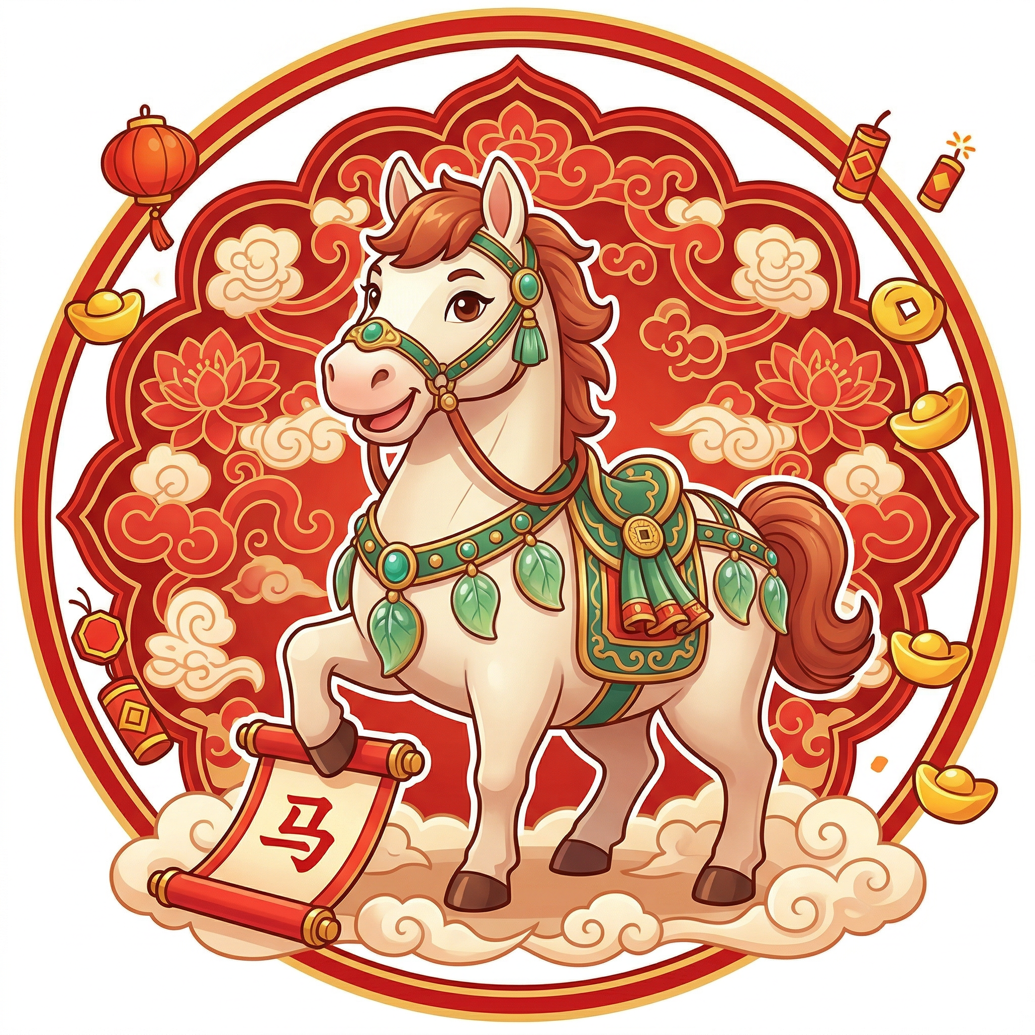 一幅Q版卡通风格的生肖主题插画,主体是一只穿着红色唐装的可爱小马,圆头圆脑带金色鬃毛,脸颊泛红笑眯眯的,双手举着写有“招财进宝”的红色灯笼,脚边散落着金色铜铃和白色雏菊,背景是浅米色的宣纸质感,整体色调温暖喜庆,充满中国风的年味,细节细腻水彩质感,柔和光影渲染,高饱和明快色调,童趣手绘感